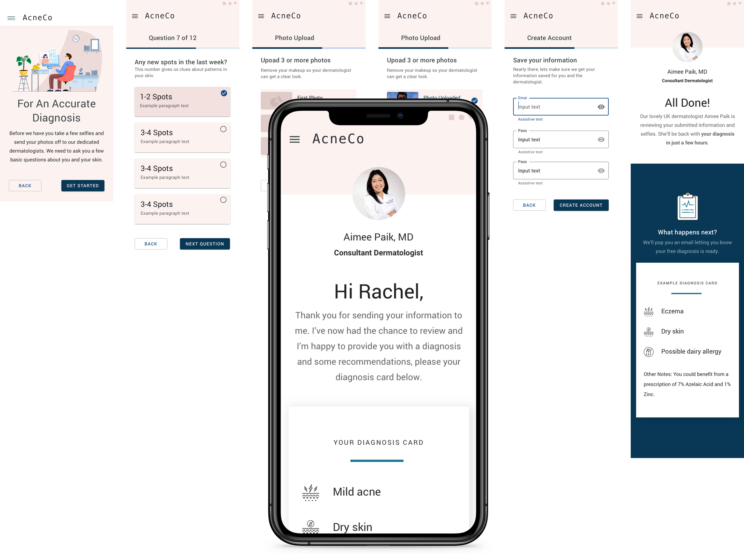 “Our hypothesis: A £15/month subscription service that connects acne sufferers with a HCP remotely via a web app. The service includes adaptive diagnosis and prescribing decisions with on-demand 1:1 chat support.”